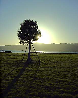 琵琶湖博物館の西側にある広い芝生公園の夕暮れ。長い影が秋を感じさせる。春分秋分の頃は、ちょうど夕陽が比叡山に沈んでいく。 |